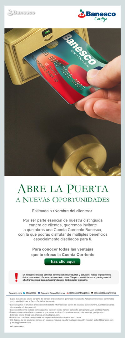 Aviso para email: Invitación al cliente a abrir una cuenta corriente Banesco, con la que podrá disfrutar de múltiples beneficios.