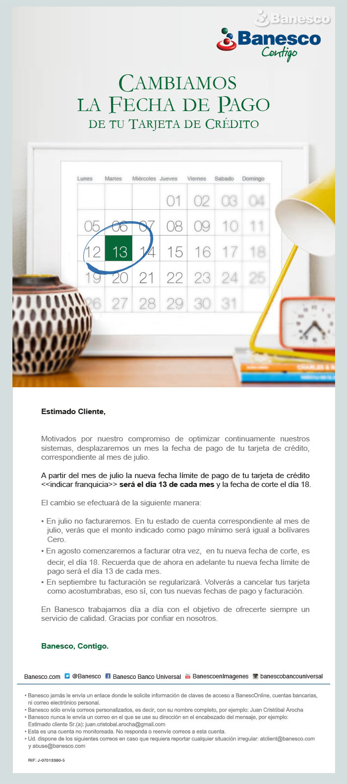 Aviso para email: Comunicado sobre cambio de pago de la tarjeta de crédito, motivado a el compromiso de optimizar continuamente el sistema, se desplazara un mes la fecha de pago correspondiente al mes de julio .