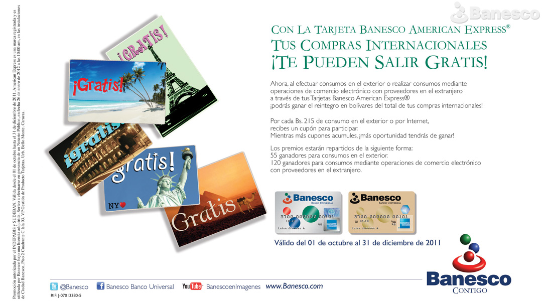 Aviso en Prensa de Promoción a la Tarjeta Banesco American Express por estacionalidad para participar por compras gratis internacionales.