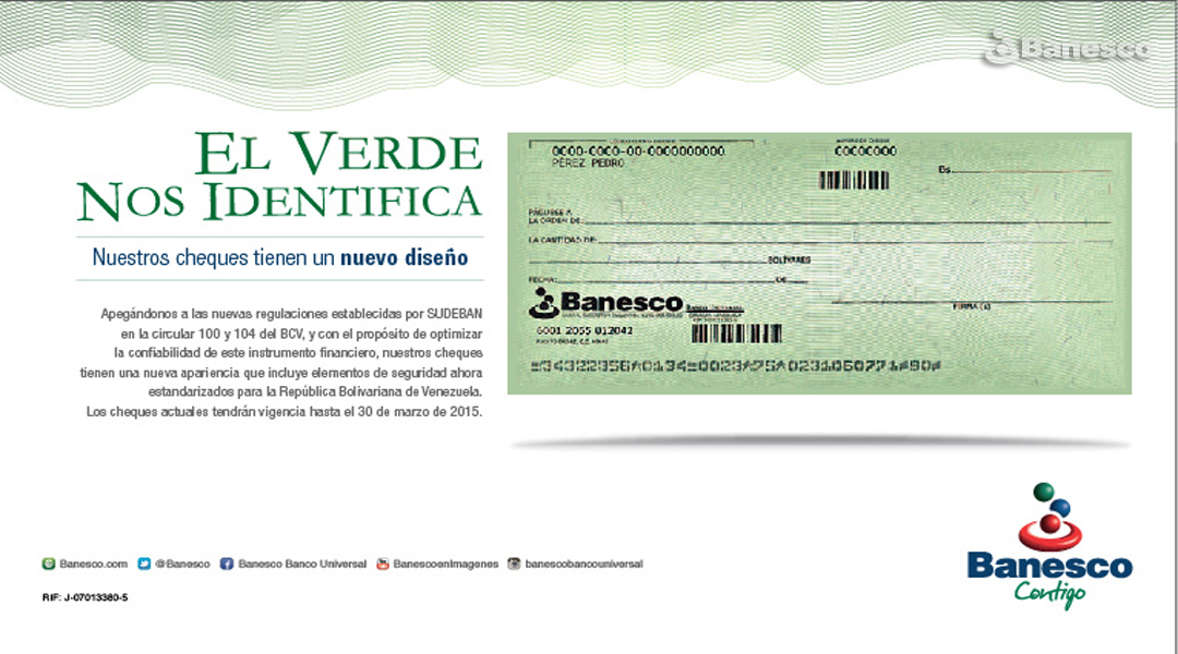 Aviso para prensa, nuevo diseño de cheques que incluye elementos de seguridad estandarizados.