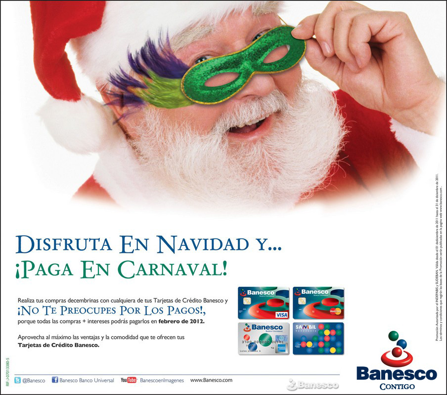 Realiza tus compras decembrinas con cualquiera de tus Tarjetas de Crédito Banesco y ¡No Te Preocupes Por Los Pagos!, porque todas las compras más intereses podrás pagarlos en febrero.