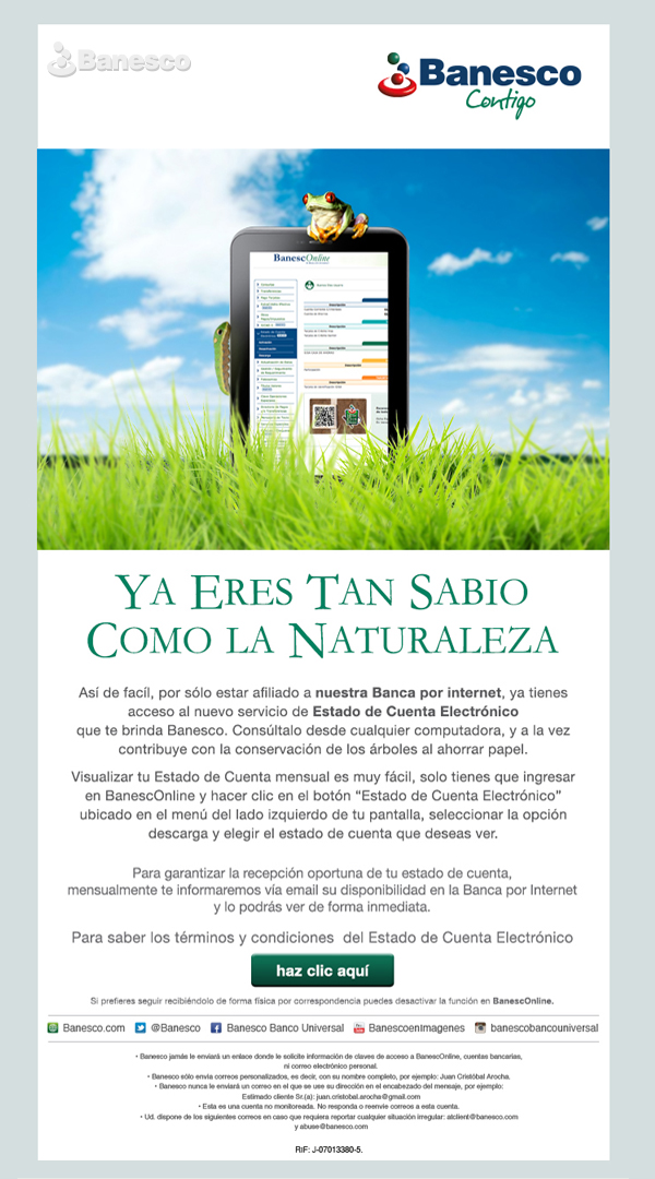 Campaña de Servicio: ''Ya eres tan sabio como la naturaleza'', ofrecido por la Banca por Internet de Banesco, mediante el cual puedes solicitar el Estado de Cuenta Electrónico desde cualquier computadora, pensando en la conservación del medio ambiente.