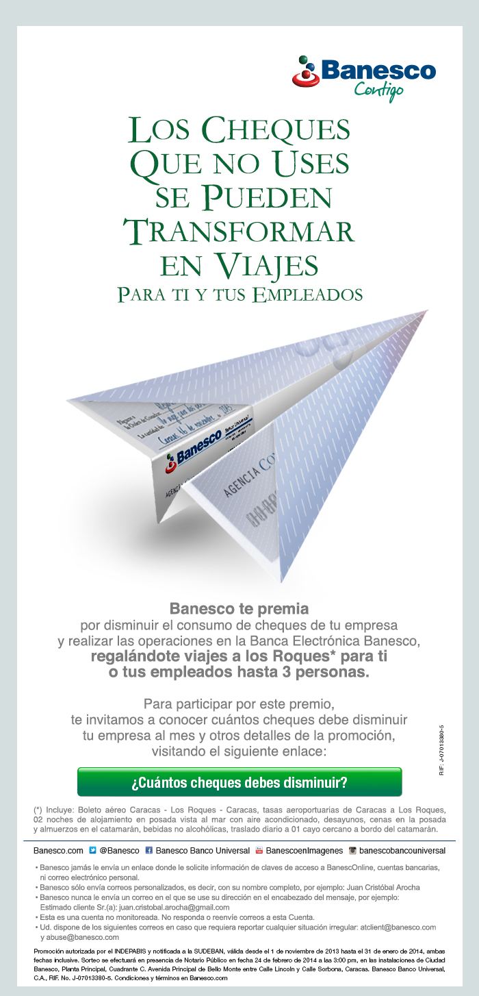 Publicidad de la Banca Electrónica Banesco: ''Los cheques que no uses se pueden transformar en viajes para ti y tus empleados'', mediante la cual promueve el uso de la Banca Electrónica para la realización de las transacciones bancarias.