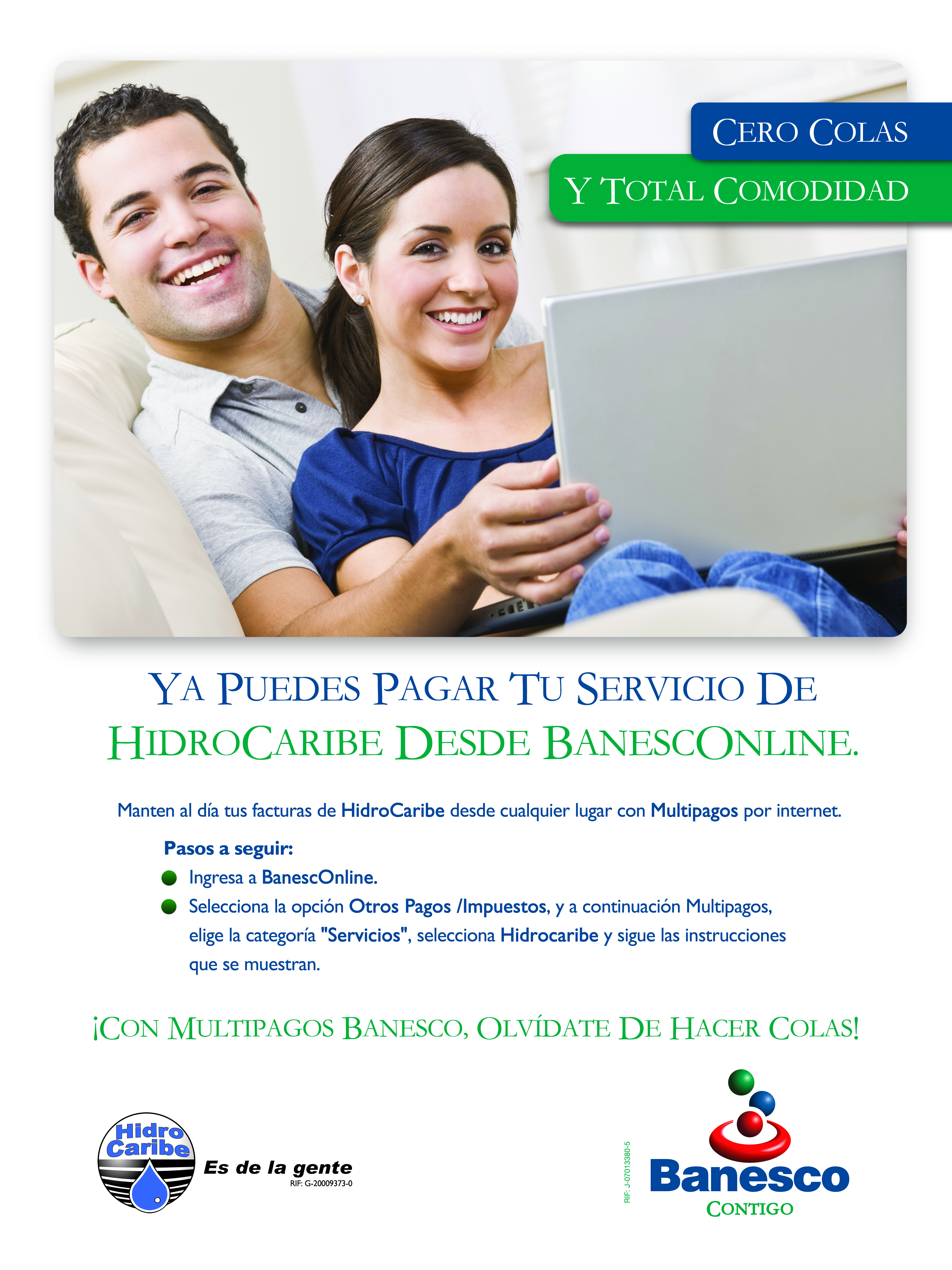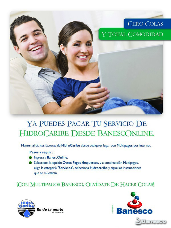 Pendón publicitario informativo sobre la disponibilidad en BanescOnline, Multipagos, para cancelar el servicio de HidroCaribe.